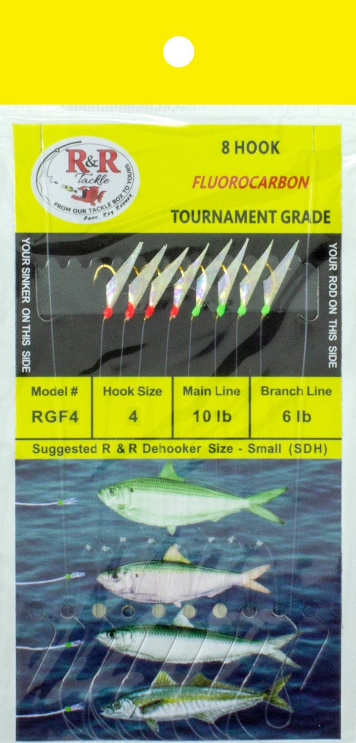 Designed to help you pull in pilchards, herring and more, the R&R Tackle Fluorocarbon Tournament Grade Sabiki Rigs 8-Pack offer corrosion-resistant hooks. The rigs provide fluorocarbon main lines and branch lines with swivels and snaps for dependable use.