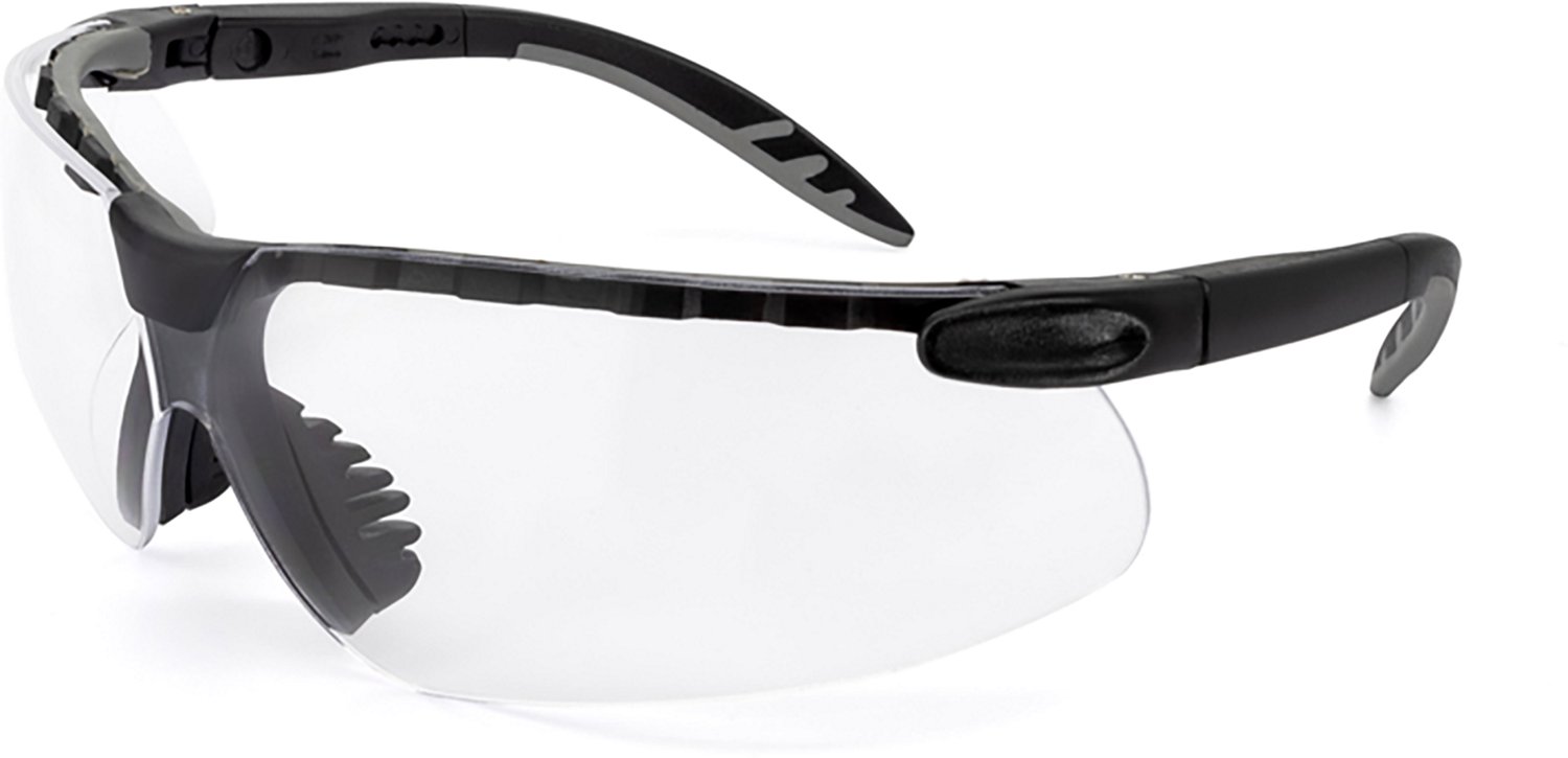 Protect your eyes with the Radians Ballistic Clear Lens Safety Glasses. Their soft, non-slip, rubber nosepiece offers a secure wear. The clear lens creates a clear view, and their telescoping temples allow for adjustability. The glasses provide 99.9% UV protection against the sun.