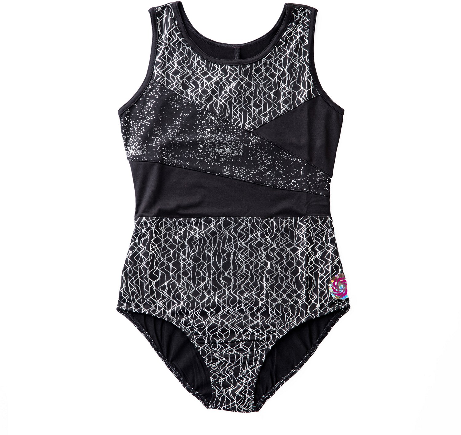 The Rainbeau Moves Girl's Foil Tank Leotard brings a touch of sparkle to her gymnastics routine. With shimmering silver foil details and bold black triangle motifs, this leotard blends style with functionality. The sleeveless design and stretchy fabric ensure she can move comfortably and confidently through every flip and twirl.