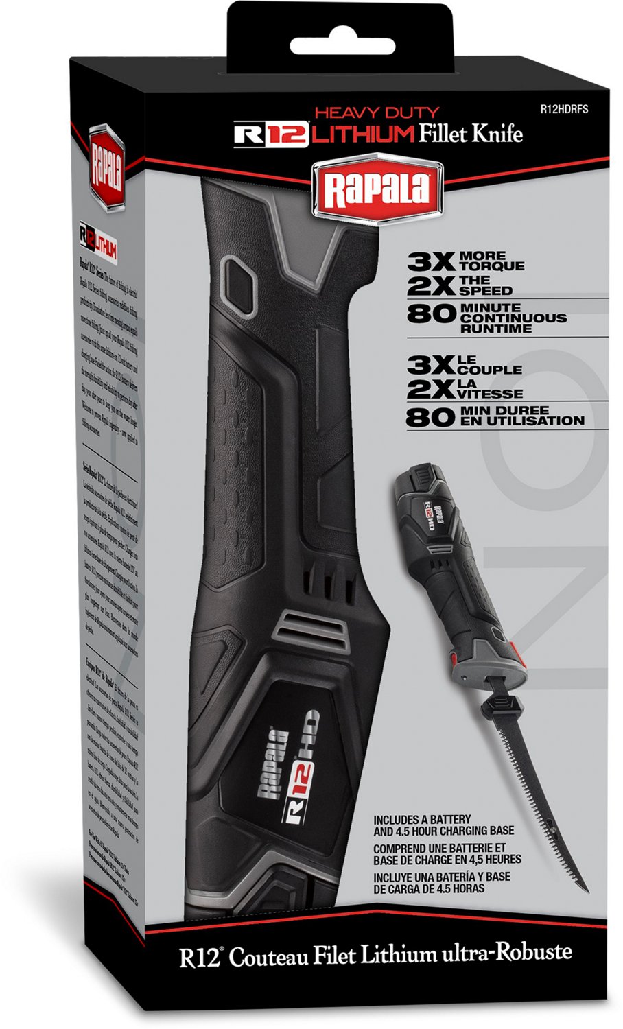 Nighttime fishing just got better with the Rapala R12 Heavy Duty Lithium Ion Filet Knife in your tackle box. This filet knife has a LED light that helps increase your visibility when the sun sets, and it has a fixed, serrated blade that filets meat with ease. The PTFE-coated stainless steel blade is water-resistant to avoid corrosion.