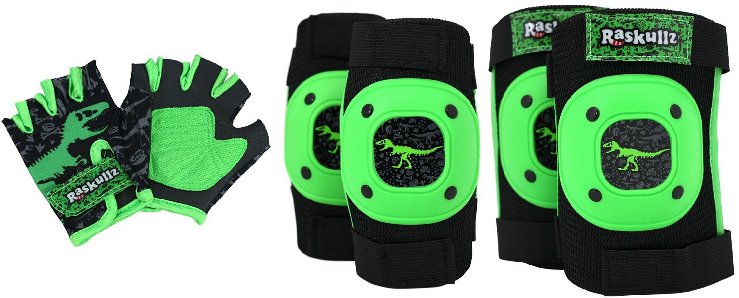 Keep your little one adventure ready whenever you have the Raskullz Boneyard Pad Set. This set includes 2 knee pads, 2 elbow pads, and 2 gloves and helps keep kids protected when riding their favorite wheeled toys. The elastic straps and hook and loop closure allow for a custom fit, while the bright vivid colors and awesome dino print graphics encourage visibility and add style to their ride. Fits most kids 3 years and up.