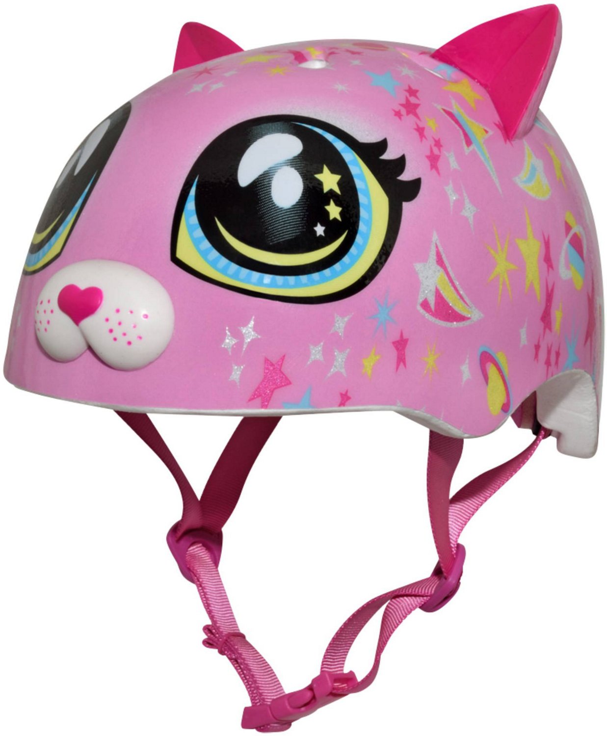 Gear up for a fun bike ride with the Raskullz Kids' Astro Cat Helmet. Constructed with a PVC shell, this helmet provides protection, while the polystyrene foam interior offers comfort as well as additional protection. The aerodynamic cooling vents promote breathability, and the 3D kitty ears and snout along with a glittery astrological design deliver a cute look.