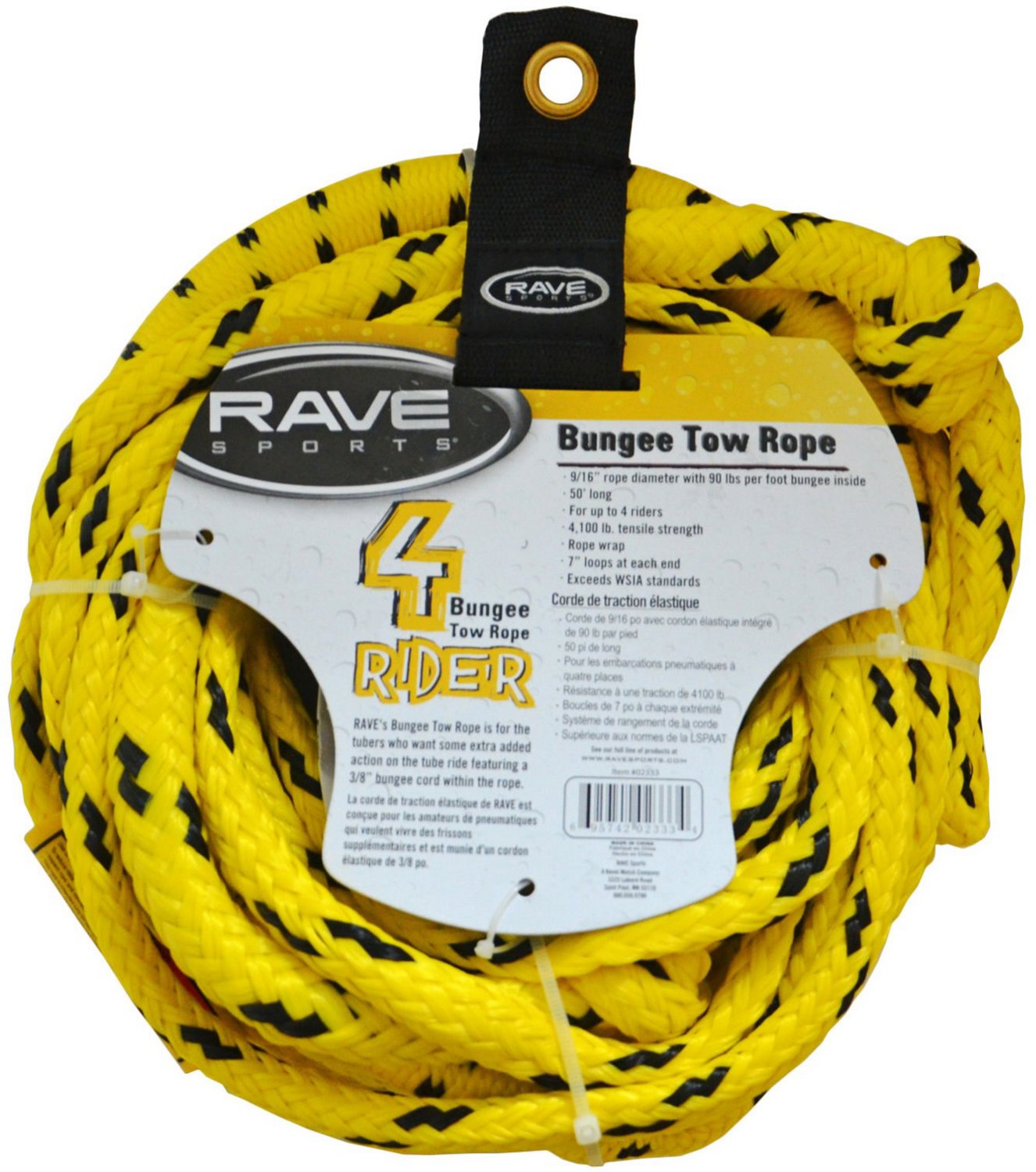Get in on the action with the RAVE Sports 4 Person Bungee Tow Rope. The rope has a tensile strength of 4100 pounds, making it suitable for use with 4 person towables.