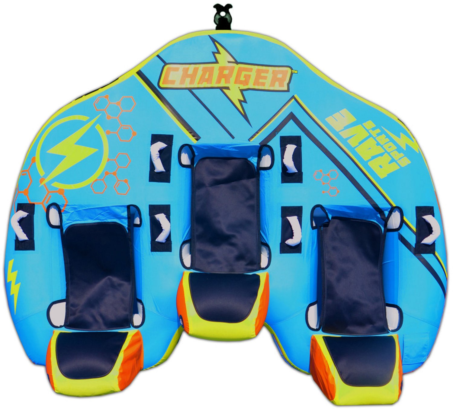 Charge into wild water fun with the RAVE Sports Charger Inflatable Towable. This 3-person ride features suspended hammock seats and high backrests for comfort while enjoying a day of thrills. The inflatable design and quick-connect tow point allow quick setup for easy fun, while the heavy-duty construction offers durability in marine environments.