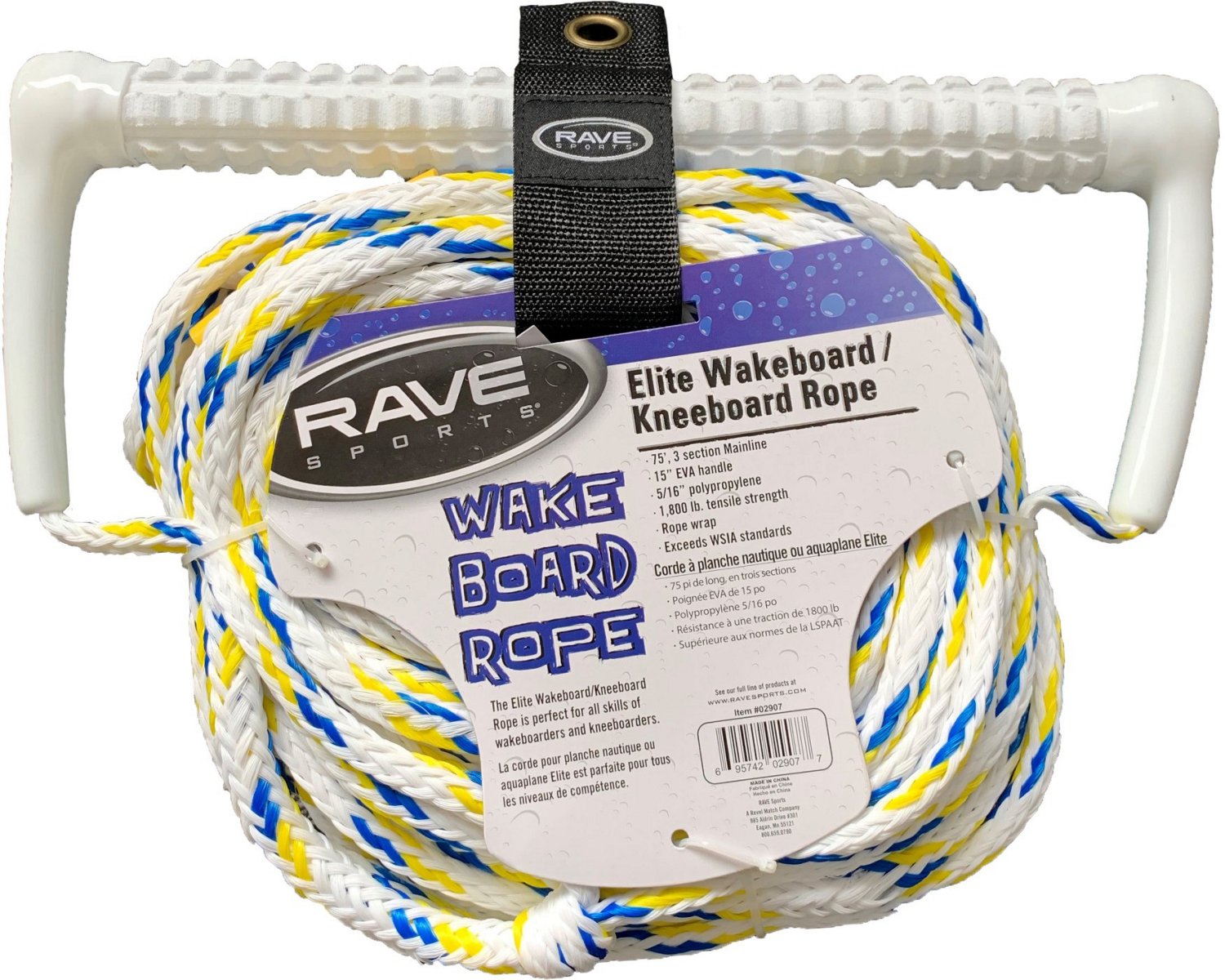 Practice wakeboarding at different wake heights with the RAVE Sports Elite 3 Section Wakeboard Rope. This 75-foot long rope features 3 removable sections, letting you adjust the length and challenge level. A durable aluminum handle offers resistance against corrosion, while EVA foam provides a comfortable padded grip.