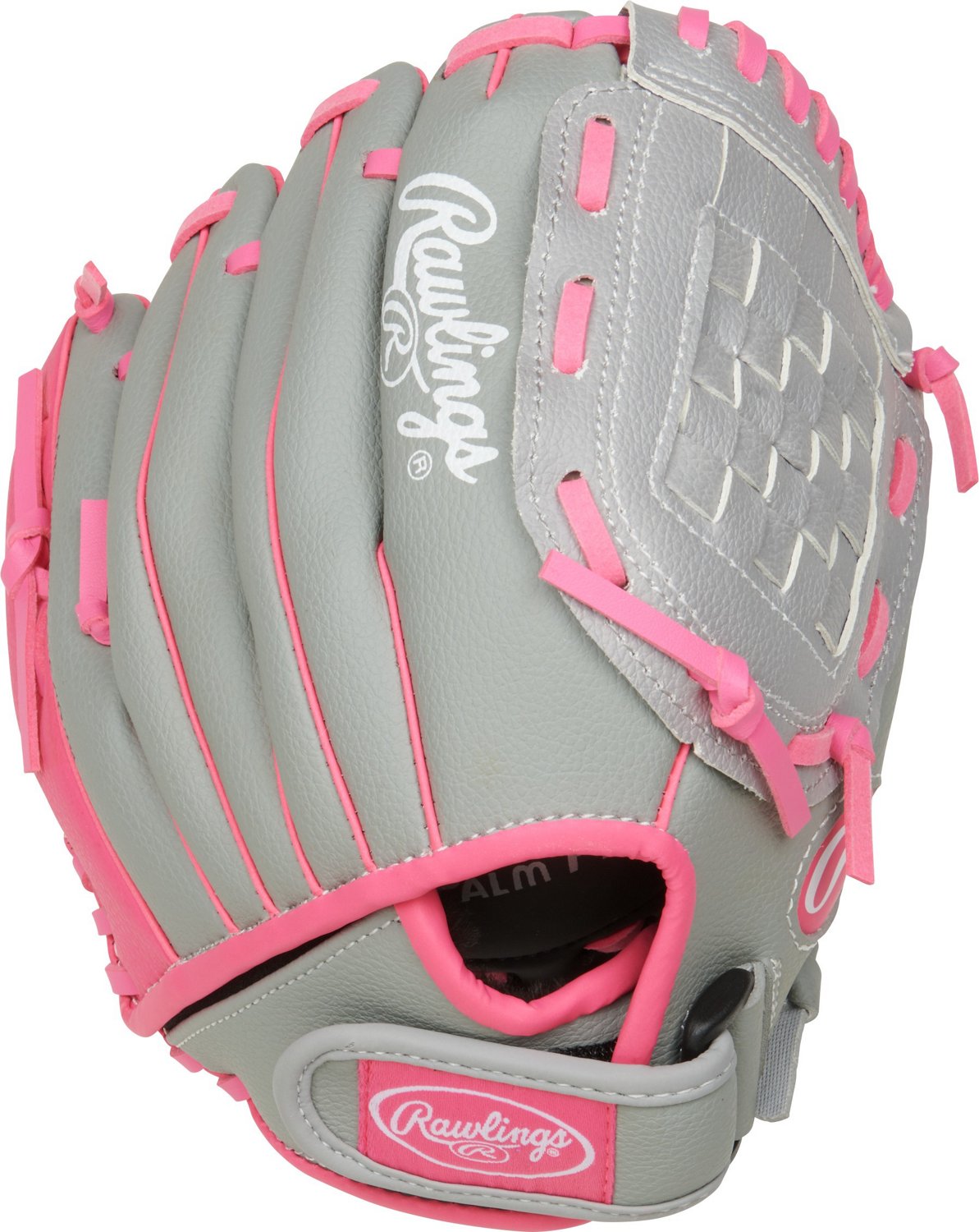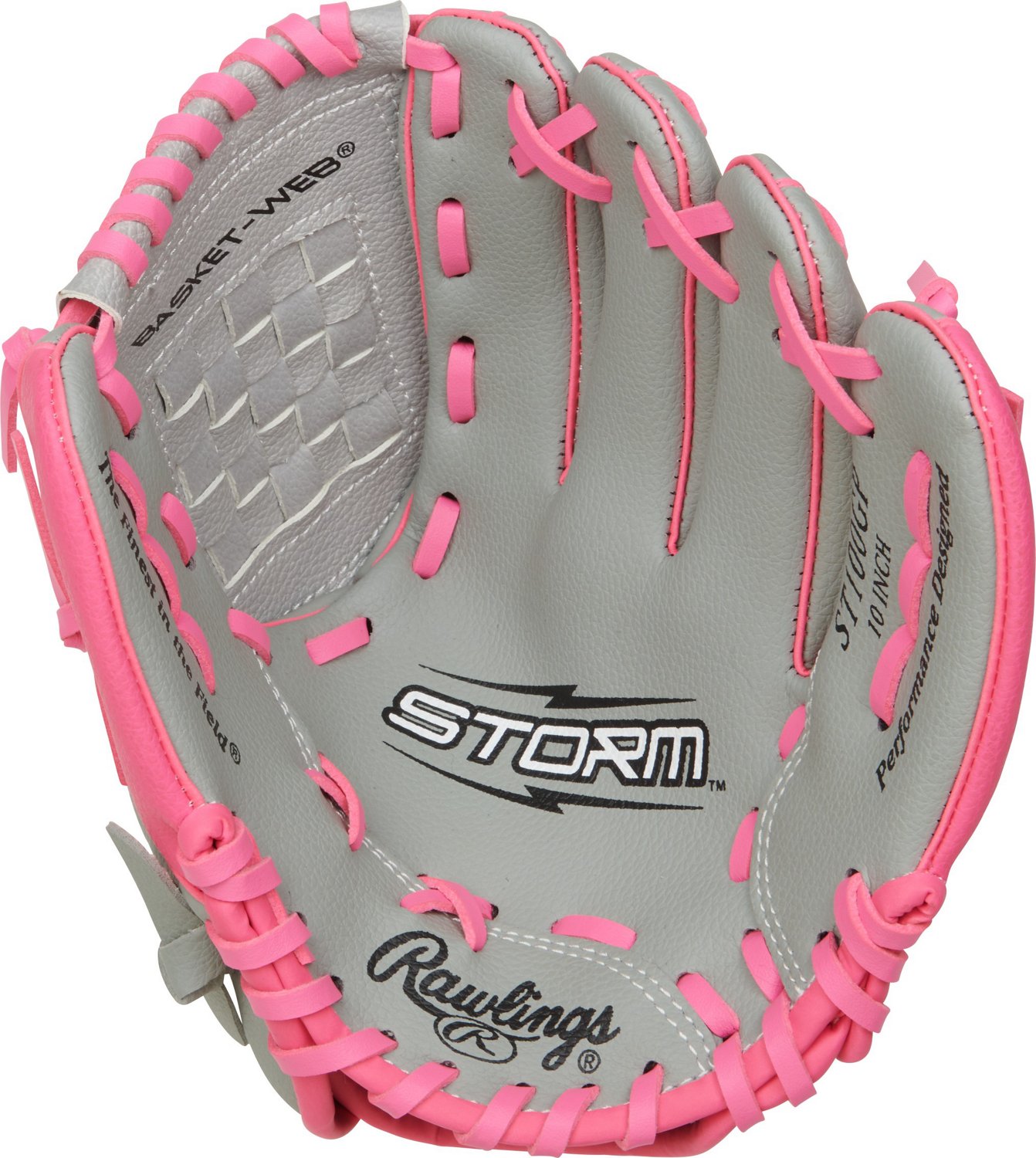 She will enjoy stepping on the field and showing off her skills with the Rawlings Girls' Storm T-ball Softball Glove. The pigskin leather construction offers a soft, flexible feel. The Sure Catch design promotes better ball control, while the Pro Taper fit ensures comfortable wear.