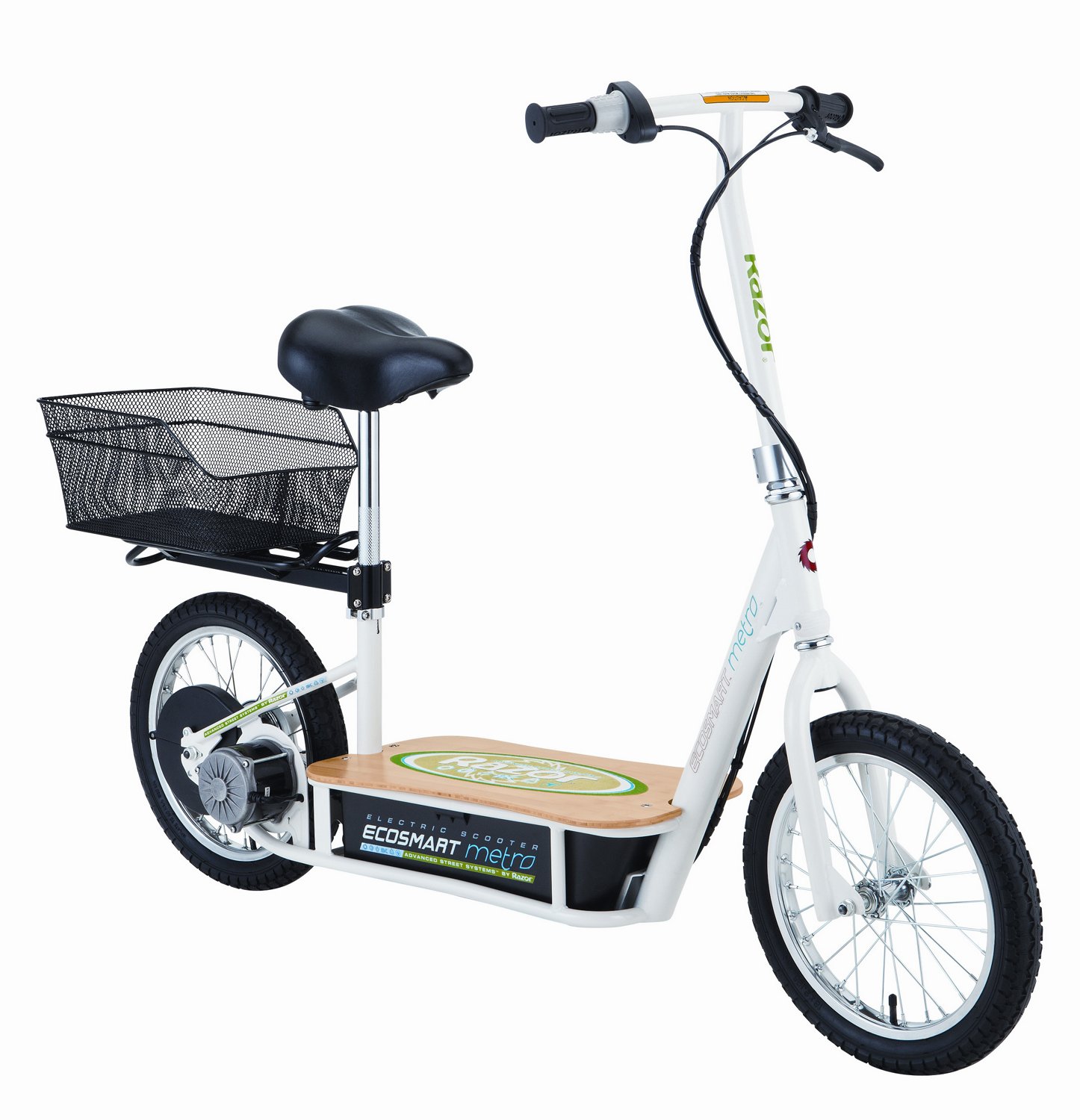 Ride around town on the Razor® Adults' EcoSmart Metro Electric Scooter, which uses a quiet electric motor to power the scooter to speeds of up to 18 mph. Designed with a twist-grip throttle and 16" pneumatic tires, the scooter features a sturdy steel frame and a bamboo deck for stability and a luggage rack on the back with a mesh basket for your belongings. The battery system delivers up to 40 minutes of continuous use.