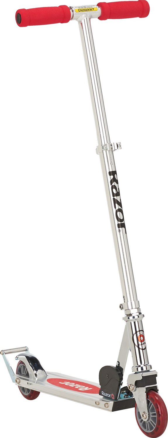 The Razor® Kids' A2® Kick Scooter features a rear wheelie bar so kids can perform tricks with ease and 98 mm urethane wheels with ABEC-5 bearings for a smooth ride. The T-tube frame and deck are constructed from aircraft-grade aluminum for durability, while the springless front wheel shock system and rear fender brake ensure safety. The handle bars feature comfortable foam grips and are adjustable, and the scooter folds up for travel and storage. Recommended for ages 5 years and up.