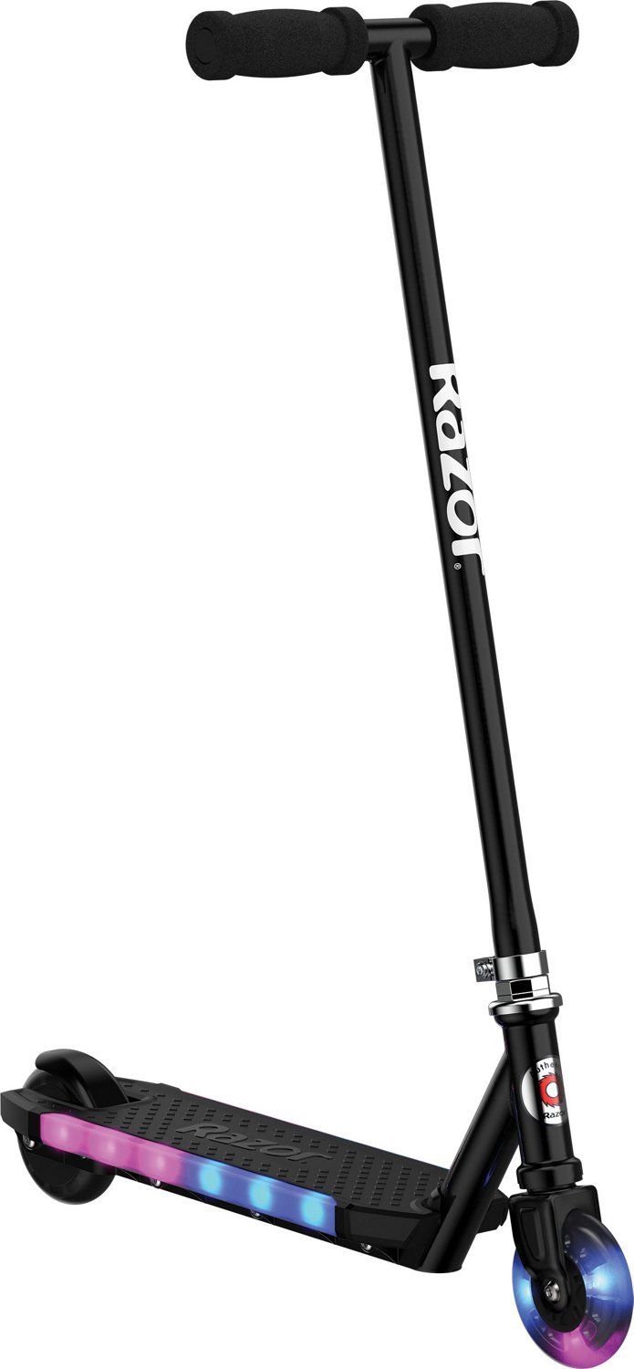 Your little one will be cruising for hours on the Razor Kids' Kick 2 Glow Scooter. The steel, rear-fender brakes provide dependable stopping, and the adjustable handlebars deliver a personal fit. The urethane front and rear wheels with light up front tires ensure long-lasting use and a bright ride, and the foam grips offer soft handling.
