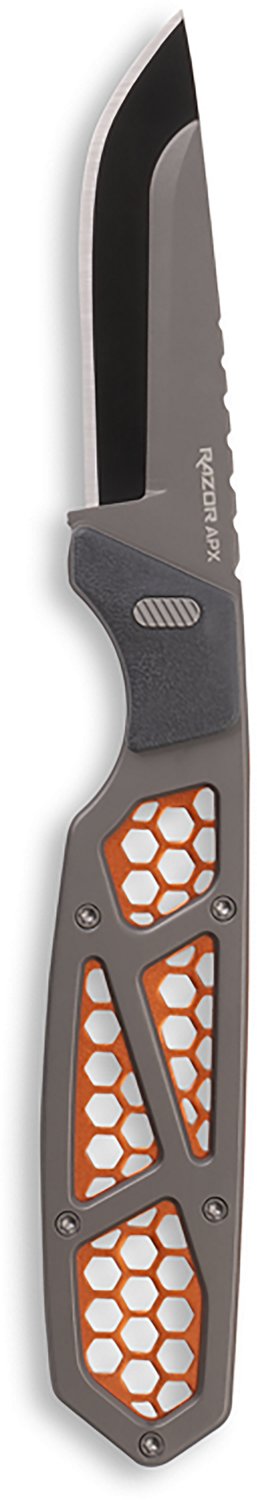 Swap out blades for a variety of cutting tasks with ease using this Razor APX Folding Knife's RazorSafe system. It includes 1 saw, 3 black blades and two cape blades, each with 420J2 stainless-steel construction for durability. The spring-assisted pivot lets you deploy the blade to get working quickly. 0.22 lbs. 3-inch blade length. 7.3-inch overall length.
