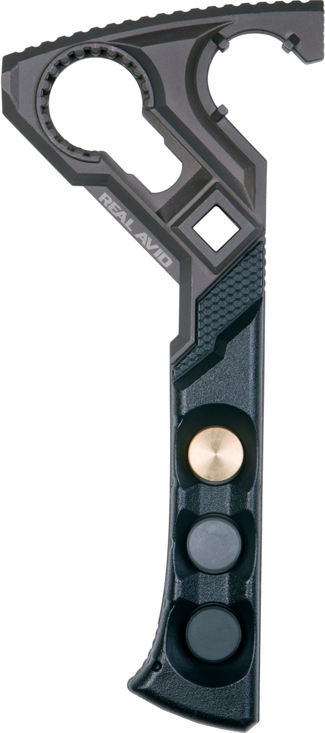 For a tough and versatile tool that gets the job done, use the Real Avid Armorer's Master Wrench. This master wrench sits squarely for a no-slip fit on stubborn barrel nuts, castle nuts, muzzle brakes, or fixed stock receiver extensions, and the torque wrench attachment is optimally positioned to provide consistent torque for all nuts. The interchangeable hammer heads allow for versatile use.