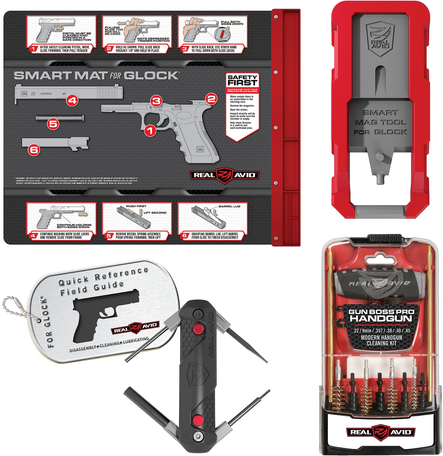 Keep your Glock handgun in tip-top shape with the Real Avid Glock with 4-in-1 Tool Kit. This kit contains all you need to clean and maintain any Glock handgun. The smart mat provides a clean and organized surface, while the smart mag tool cleans your magazine. Also included are a field guide, a 4-in-1 cleaning tool and a handgun.