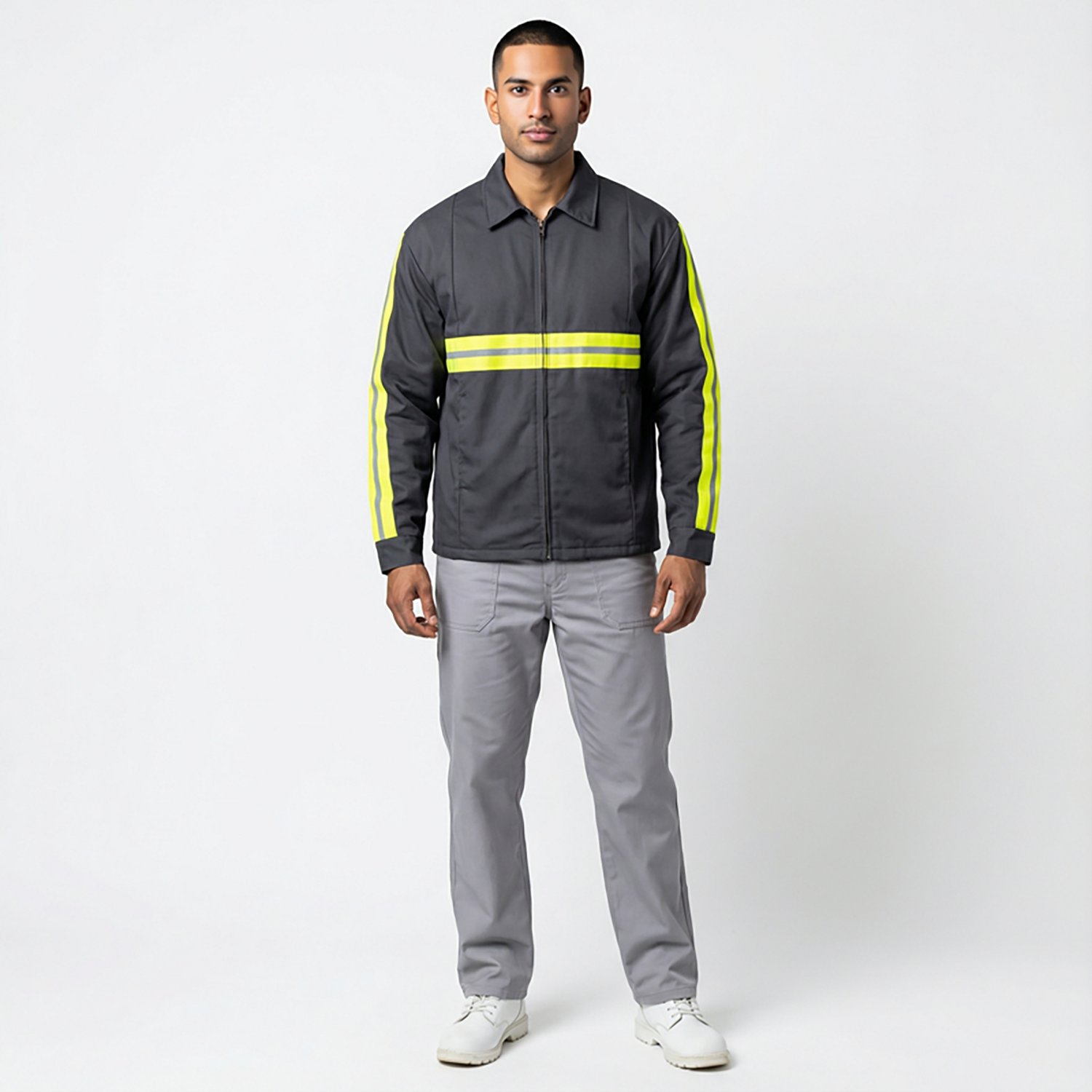 High-visibility stripes on the sleeves and across the mid-section help you be seen in low-light conditions