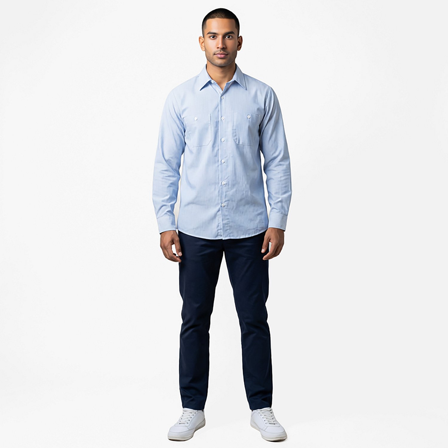 Dual chest pockets with button closures, angled bar tacks and a pencil stall on the left pocket