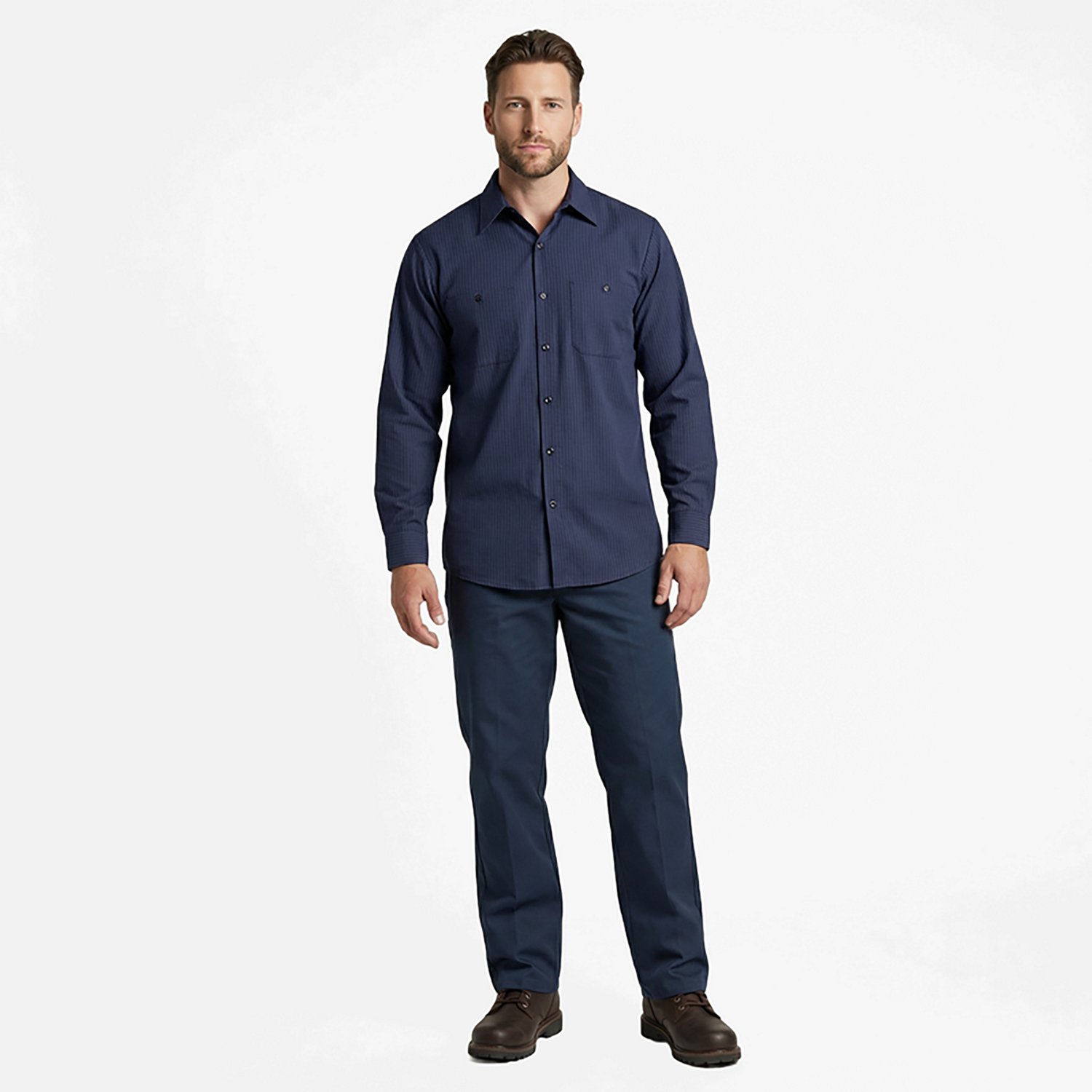 Dress for work in the Red Kap Men's Long Sleeve Durastripe Work Shirt, which features fade-resistant Touchtexâ„¢ stripes. This poplin button down features a moisture-wicking finish for comfort and a pre-cure durable press finish with soil release for stain resistance.