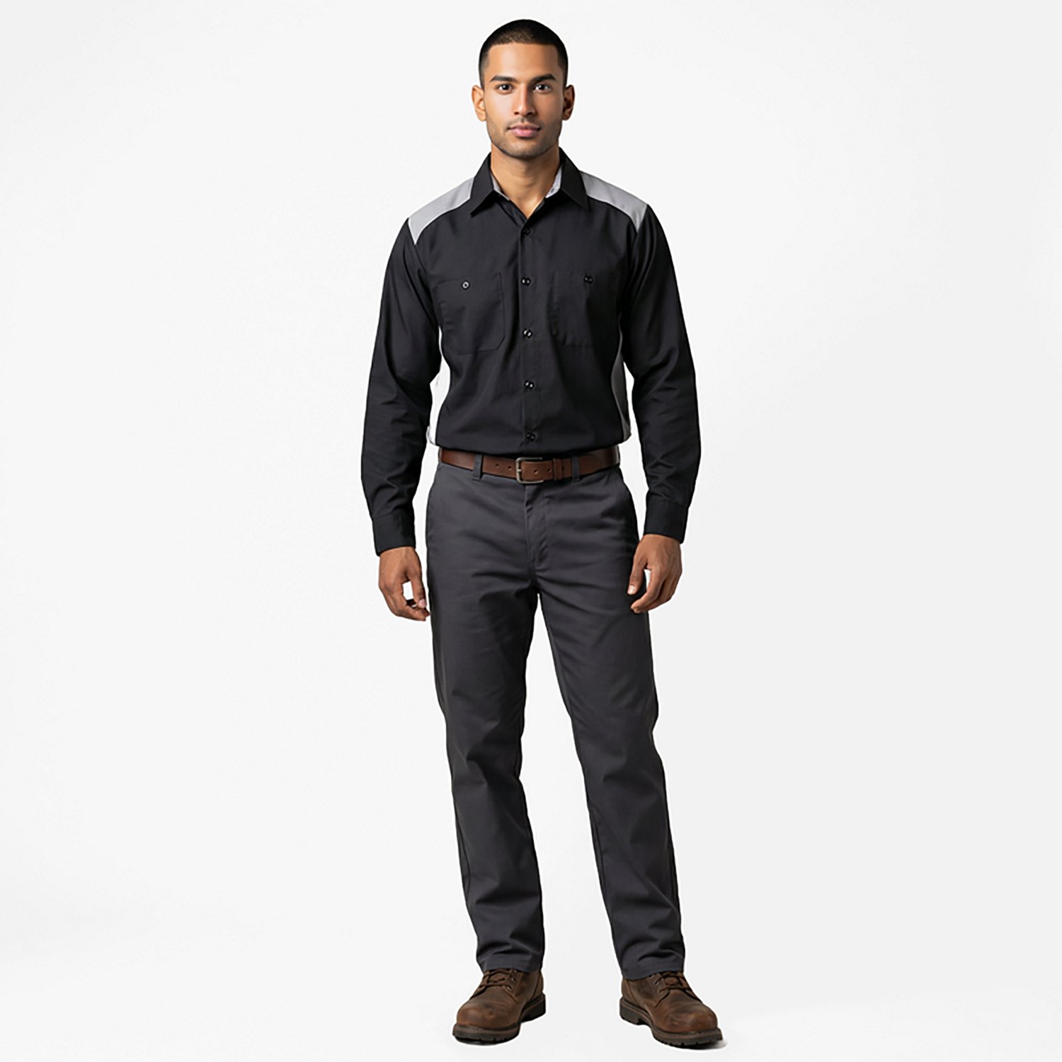 Dual hex-style chest pockets with angled bar tacks