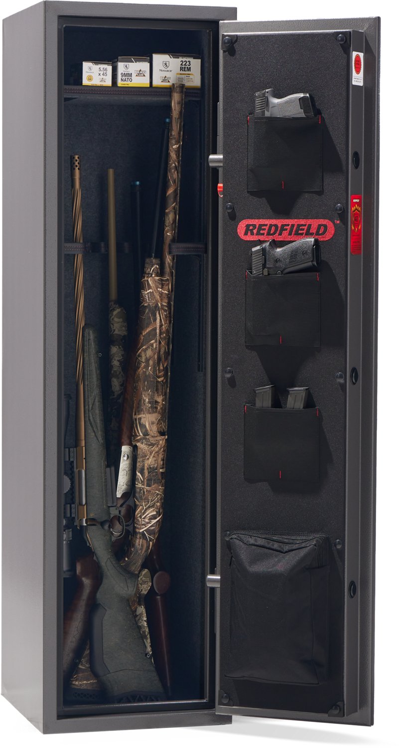 Keep your firearms secured with ease using the Redfield 12 + 3 Gun Safe. Made with 14 gauge steel with a powder-coat finish for durability, this gun safe comes with 5 locking points controlled by an electronic keypad to give you enhanced protection.