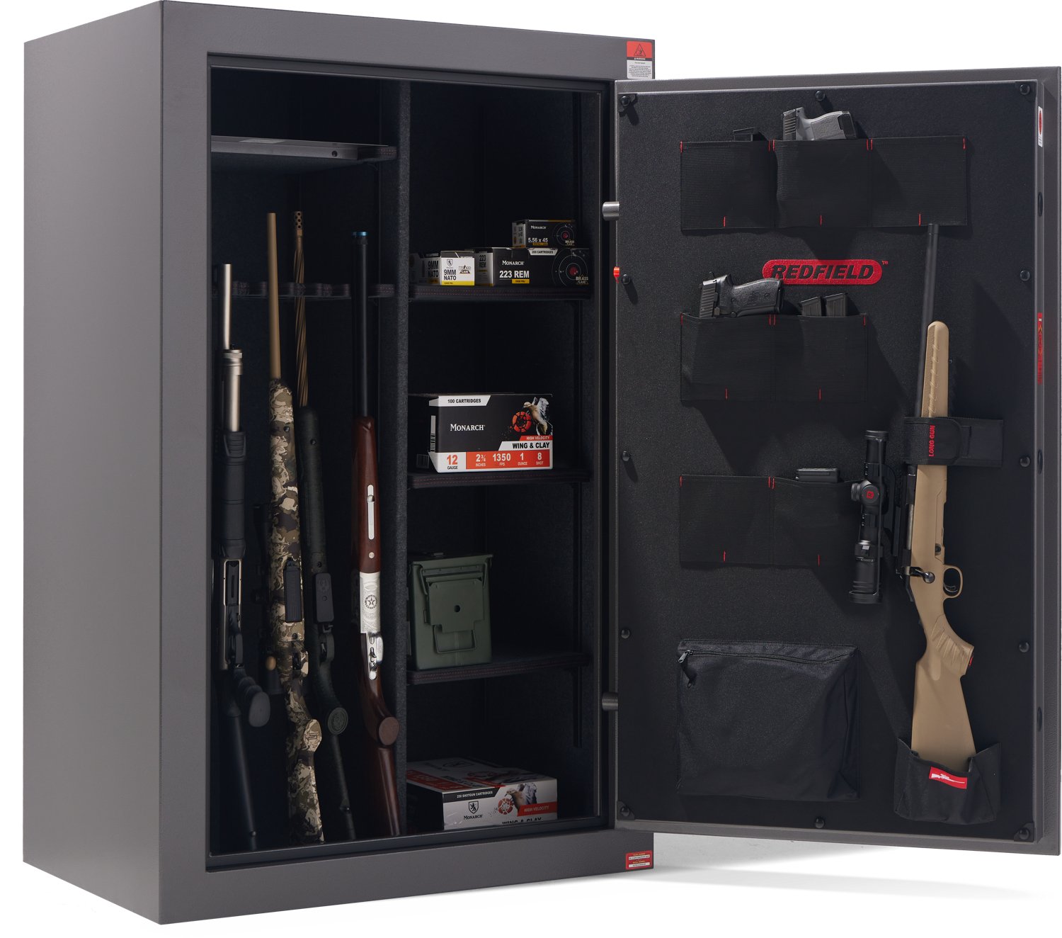 Keep your guns safe with the Redfield 48 + 8 Gun Safe. This 14 gauge steel gun safe holds 48 long guns and 8 handguns and has a carpeted interior for extra cushioning to protect your guns from dings and scratches. Rated to protect for 40 minutes at 1,400 degrees F, this gun protects against fire damage. Adjustable shelves and gun racks help you stay organized while the electronic keypad and 5 locking bolts keep contents secure.