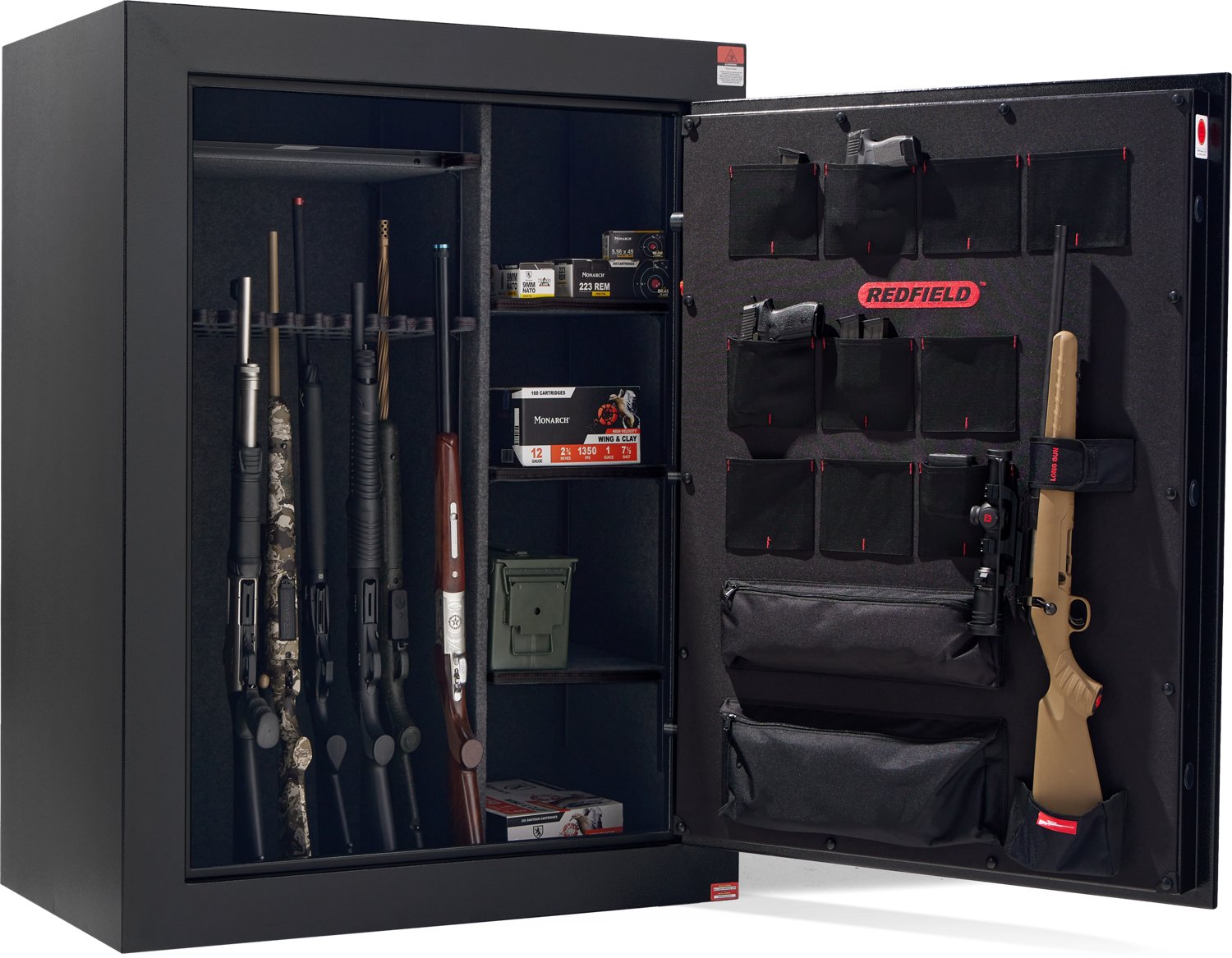 Keep your guns safe with the Redfield 64 + 11 Gun Safe. This 14 gauge steel gun safe holds 64 long guns and 11 handguns and has a carpeted interior for extra cushioning to protect your guns from dings and scratches. Rated to protect for 40 minutes at 1,400 degrees F, this gun protects against fire damage. Adjustable shelves and gun racks help you stay organized, while the electronic keypad and 6 locking bolts keep contents secure.