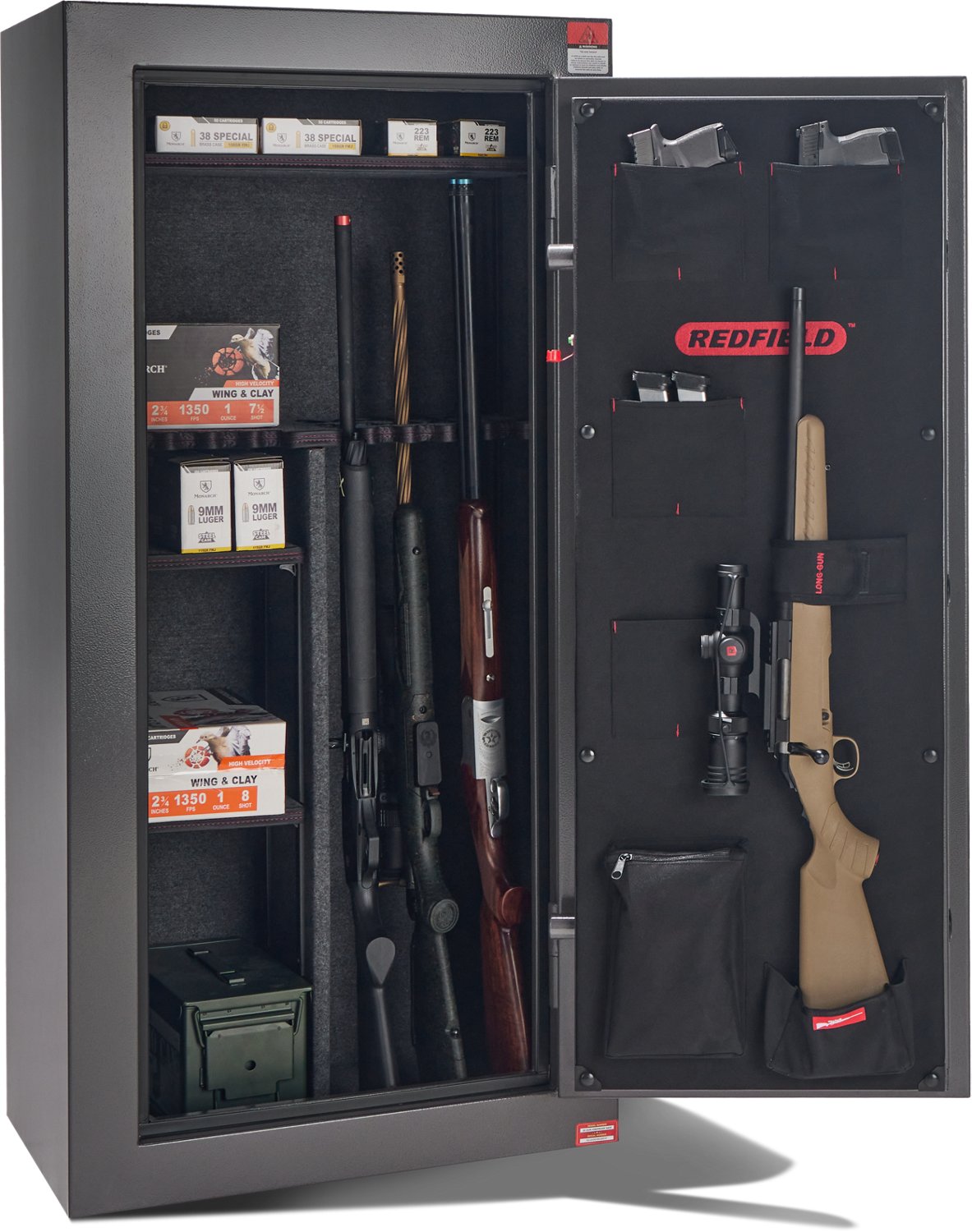The Redfield Fireproof 30-Gun Safe is designed for secure and spacious firearm storage. Made with a 14-gauge steel body and door, this safe is built for durability and protection. It provides fire protection for up to 40 minutes at 1,400°F, offering peace of mind in case of emergencies. With an electronic lock and a system of three active bolts, two dead bolts, and two hinges, this safe offers solid protection. The spacious interior accommodates up to 30 firearms, plus additional storage for handguns and one long gun on the door. Measuring 55 inches in height and 25 inches in width, it’s a practical solution for secure firearm organization.