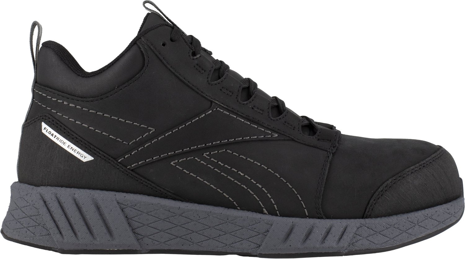 Take on aggressive work environments in the Reebok Men's Fusion Formidable Athletic Mid Cut Work Boots. The rugged leather uppers stand up to rough use and are lined with moisture-wicking mesh linings to keep feet dry. EVA and Floatride Energy Foam cushion your feet, while rubber soles and extra-wide composite toe caps protect against slips, abrasion and electrical hazards.