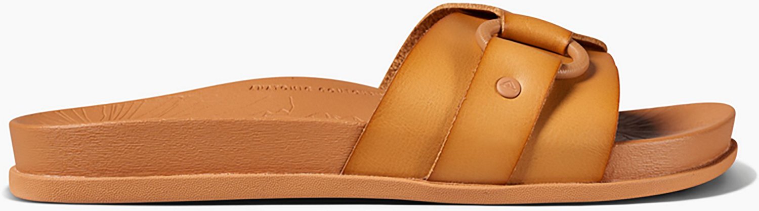 Cruise in style with the Reef Women's Cushion Soho Cruz Slides. Decorative fashion buckles on the vegan leather uppers and floral emboss in the molded PU footbeds provide a chic look, while the durable rubber outsoles offer improved stability, traction and support.