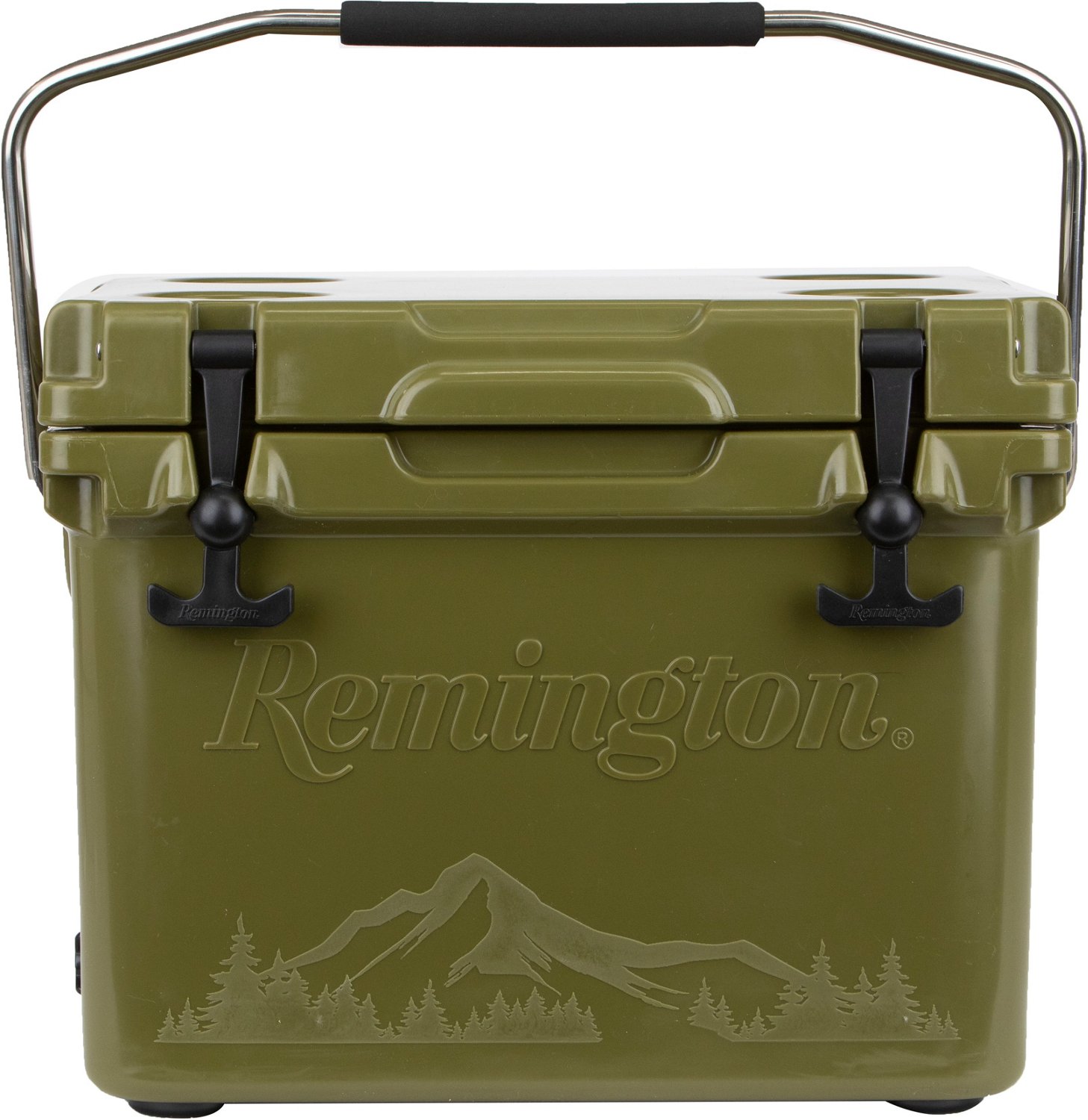 Hit the road with the Remington 25 qt Rotomolded Cooler. The double-walled rotomolded construction affords durability, while the rubber lid hatches keep contents secure. The cooler retains ice for up to 4 days to ensure contents remain cold, and the anti-slide foot pads help prevent spillage.