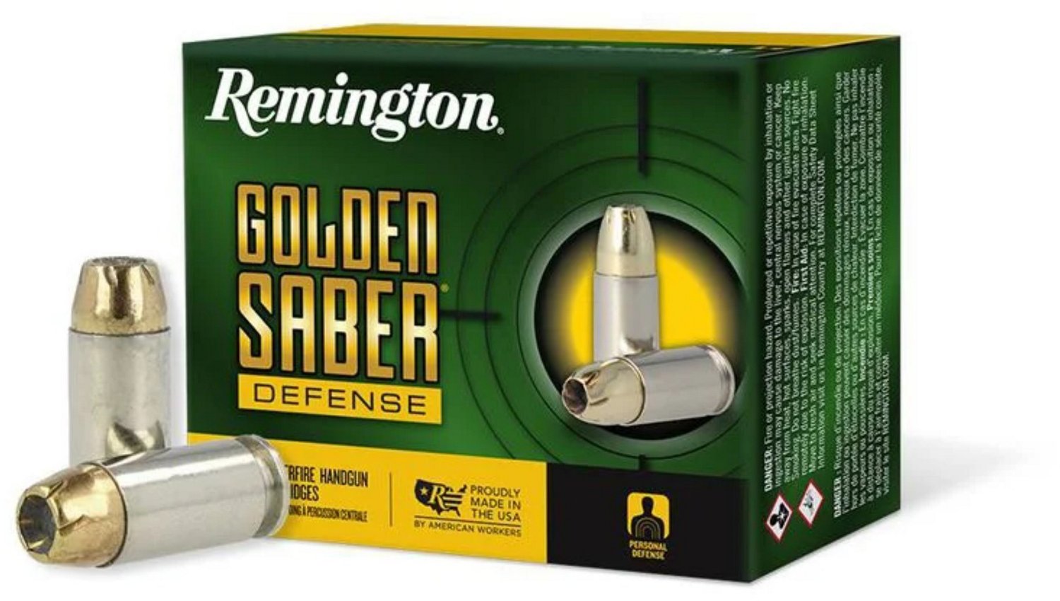 Suitable for self-defense, the Remington Golden Saber Defense .40 S&W 165-Grain BJHP Handgun Ammunition - 20 Rounds features brass jackets with precision nose cuts to control expansion and optimize energy transfer. The nickel-plated cases help minimize oxidation and improve feeding and extraction.