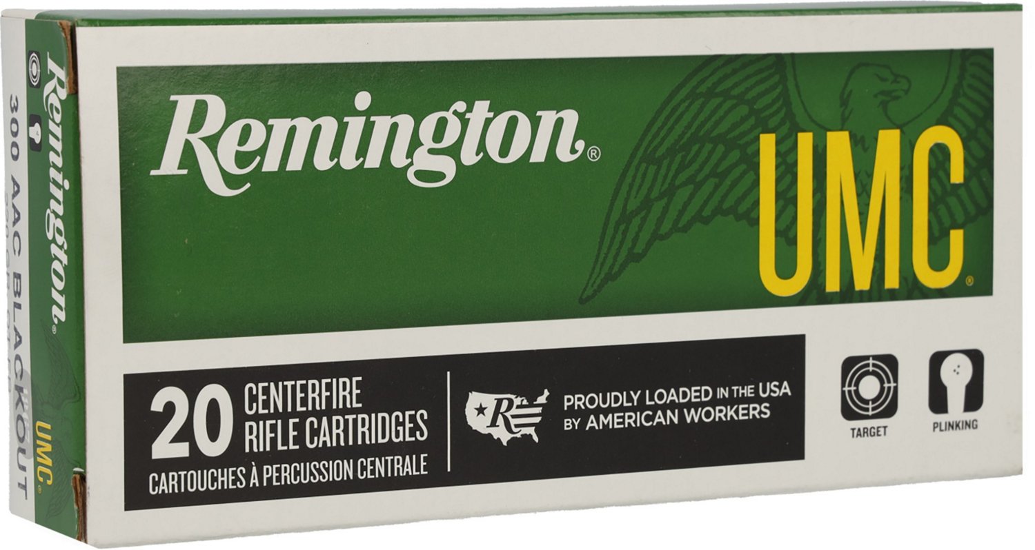 Shoot targets or snipe varmints with the Remington UMC .300 AAC Blackout 150-Grain Centerfire Ammunition - 20 Rounds. This ammunition is designed for high-volume shooting applications and features a full metal jacket for reliable feeding.
