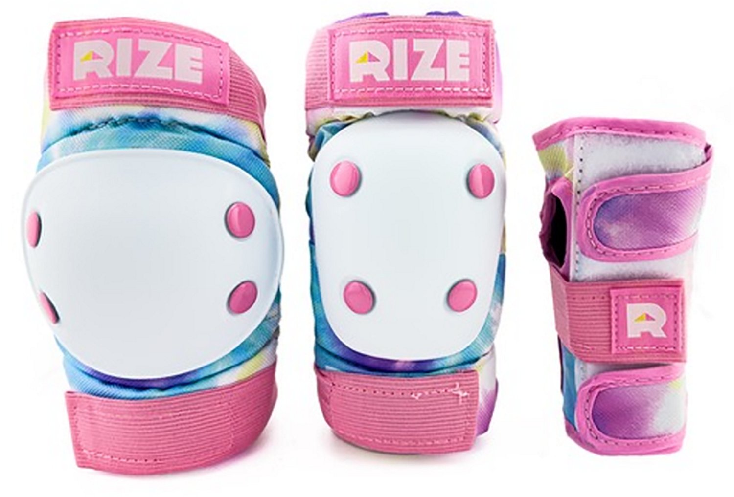 Safeguard your young cyclist's extremities while they explore the fun worlds of biking, skating and more using this RIZE Kids' Tie Dye Elbow and Knee Pad Set. It includes 3 pair knee pads, 1 pair elbow pads and 1 pair wrist guards, made of shock-absorbent EVA and abrasion-resistant nylon and featuring high-density, impact-resistant caps with reinforced rivets for durability. Adjustable top and bottom straps provide a snug custom fit.