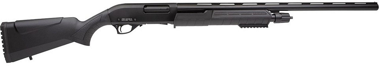 Practice your shooting skills with the Rock Island Armory Pump Action 12 Gauge Pump Shotgun. This weapon features a pump action with a 5+1 firing capacity, as well as a 22-inch barrel length. This shotgun also includes a synthetic stock and a push button safety.