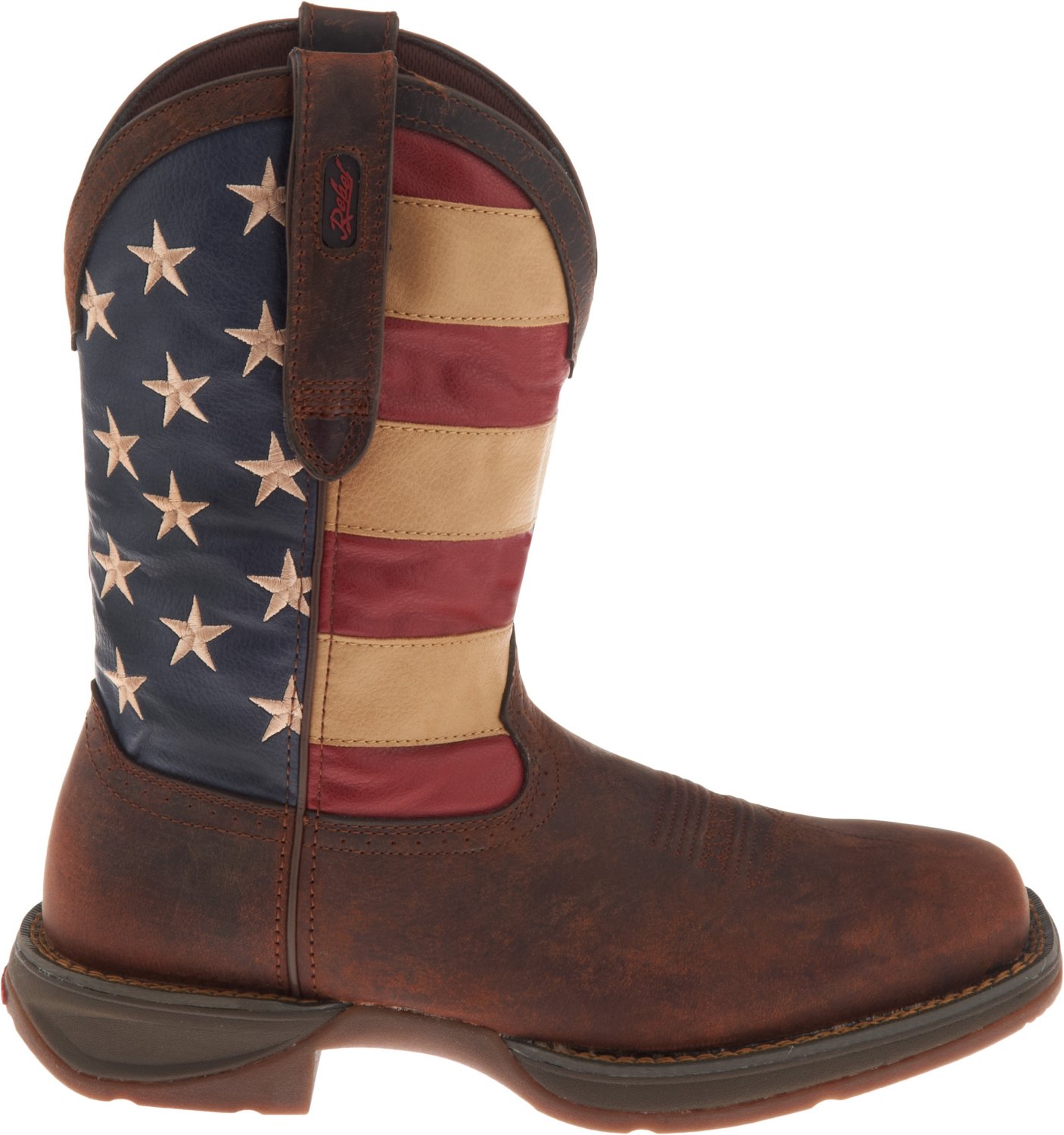 The Durango Men's Rebel American Flag Western Boots are designed with oil-tanned leather uppers for durability and American flag detailing for a cool look. The boots feature dual-density rubber outsoles for traction on multiple surfaces and EVA midsoles and polyurethane footbeds for comfortable wear. Pull-on style.