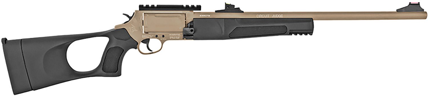 The Rossi Circuit Judge .410 Bore/.45 Colt Semiautomatic Rifle boasts semiautomatic action and has a 5-round capacity. It's built with a synthetic stock, transfer bar safety and adjustable fiber optic sights.