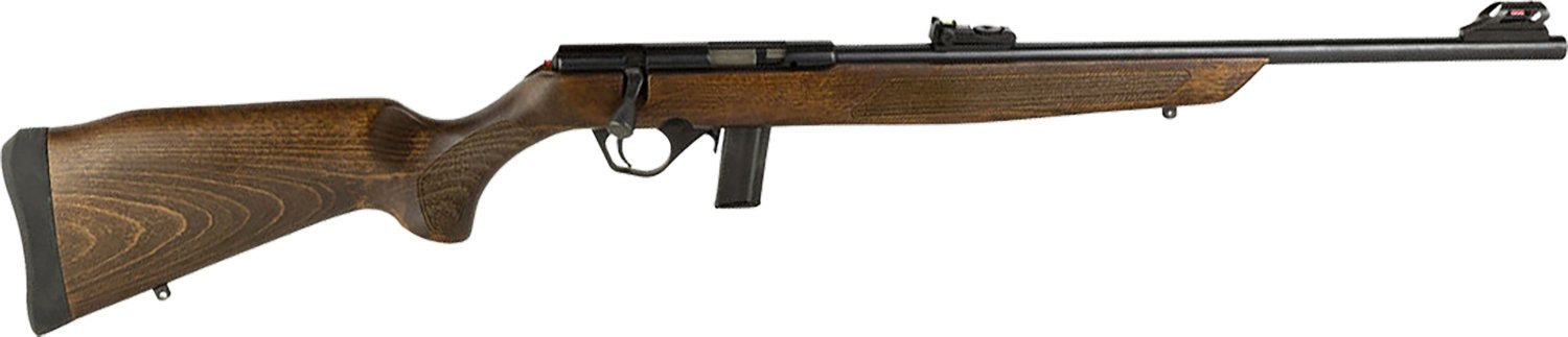 Arm yourself with the Rossi RB22 .22 LR Bolt Action Rifle. It's bolt action with a 10-round capacity. The barrel is 18-inch stainless steel, and the receiver has a stainless steel dovetail base. Its front and rear sights are fiber optic.