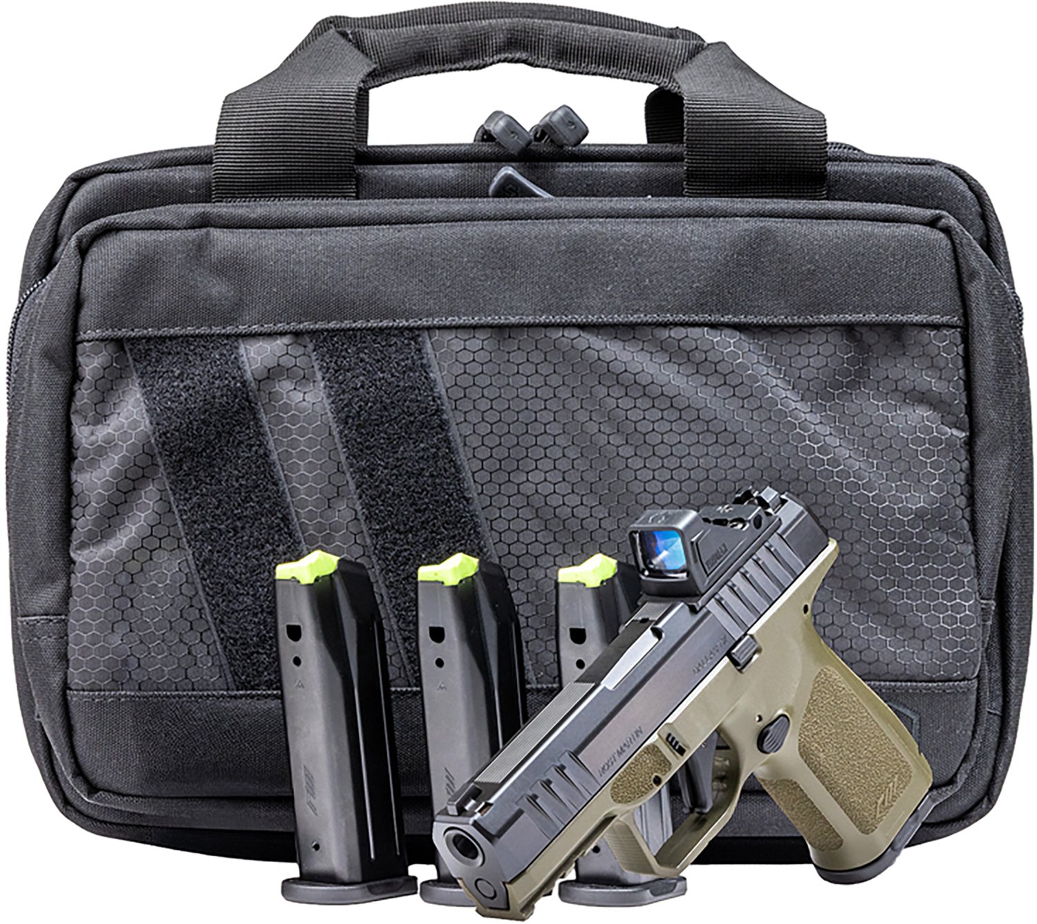 4-inch match-grade steel barrel with a polymer frame and Picatinny rail, an optic-ready serrated steel slide and textured grip