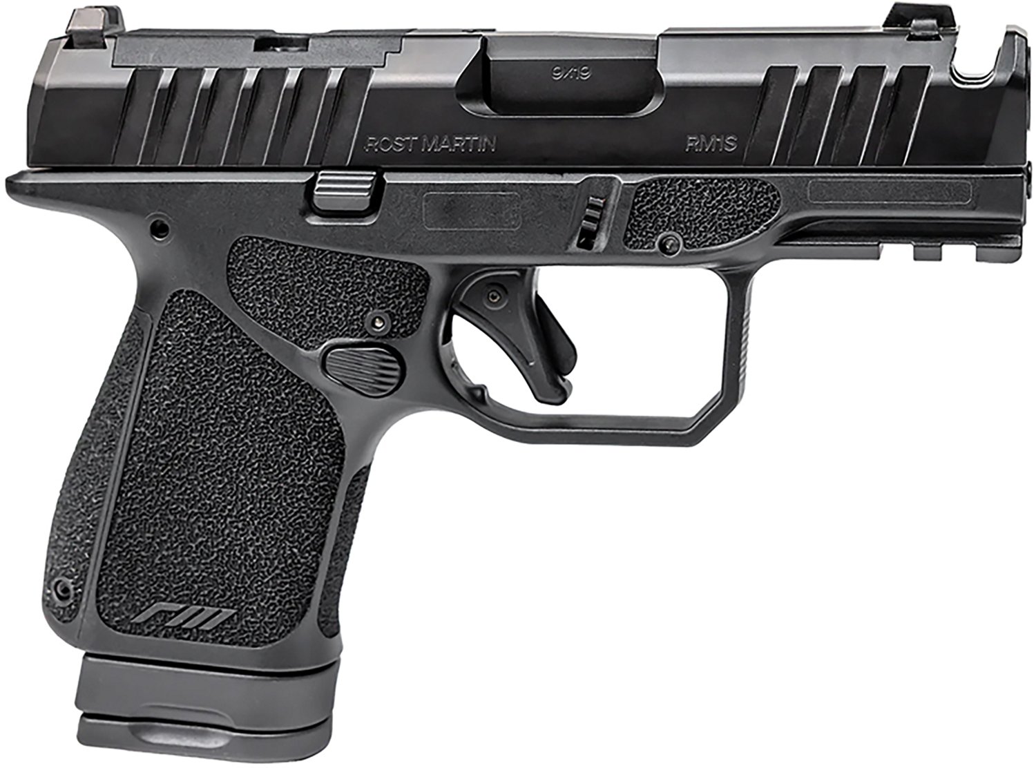 The Rost Martin RM1S 9mm Pistol has a 3.6-inch match-grade steel barrel and a capacity of 10+1 rounds. This subcompact double-action handgun is optics-ready with a Picatinny rail on a polymer frame and a serrated steel slide so you can use your favorite scope. Also featured are interchangeable backstrap grips for a secure grasp in the field, an integrated compensator and a crowned muzzle. Additionally, a white dot sight in the front and a black serrated sight in the rear make it easy to find your target with the Rost Martin RM1S 9mm Pistol
