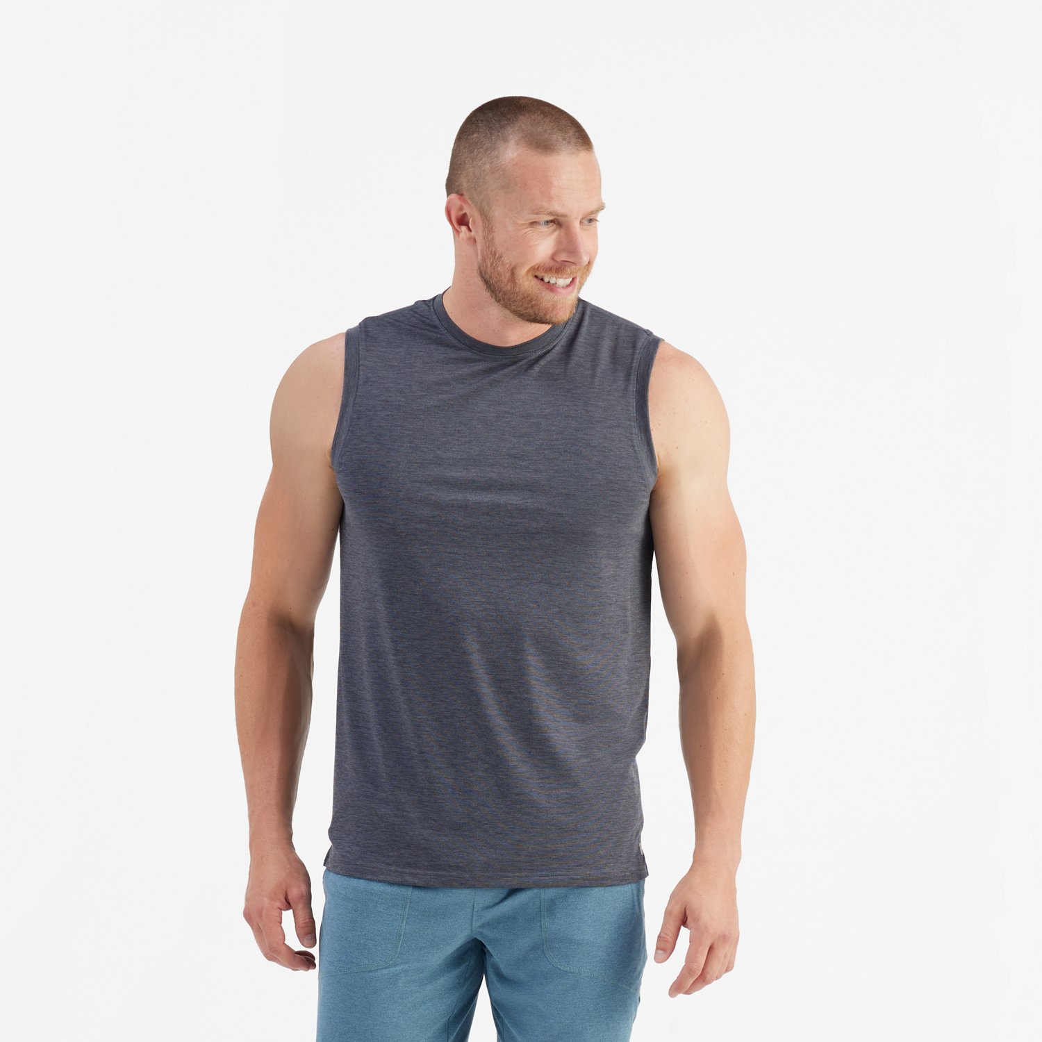 R.O.W. Men's David Tank Top is a versatile men's tank top designed for both lifestyle and training activities. Crafted from a comfortable polyester blend, this athletic shirt features a classic crew neck and a sleeveless design. Side vents enhance breathability, making it ideal for your workout sessions or everyday wear. This adult men's tank is easy to care for with machine washing.
