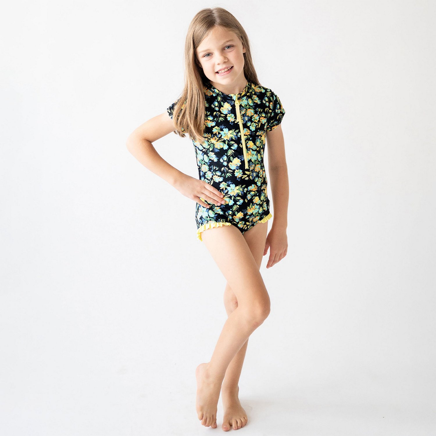 Keep your skin safe while swimming in the RuffleButts Girls' 4-7 Midnight Garden Waterfall Rash Guard One Piece Swimsuit. The nylon/spandex construction withstands wear and tear while remaining soft, and the floral design highlights a stylish, fun look. The UPF 50+ protection blocks the sun's harmful rays from your skin.