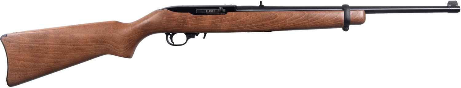 The Ruger 10/22 .22 LR Carbine Autoloading Rifle is a top choice for hunting enthusiasts. This rimfire rifle features an autoloading action with a 10-round magazine capacity, making it suitable for extended shooting sessions. Its 18.5-inch barrel and a total length of 37 inches provide a balanced feel, while the hardwood stock adds to its durability and classic look. The rifle is equipped with a gold-bead front sight and an adjustable rear sight, facilitating precise aiming. The black matte finish on the metal parts complements the rifle's sleek design. Weighing in at just 5 pounds, this right-handed rifle is lightweight and easy to handle. Though optic ready, it comes without an optic equipped, allowing you to customize it to your preference.