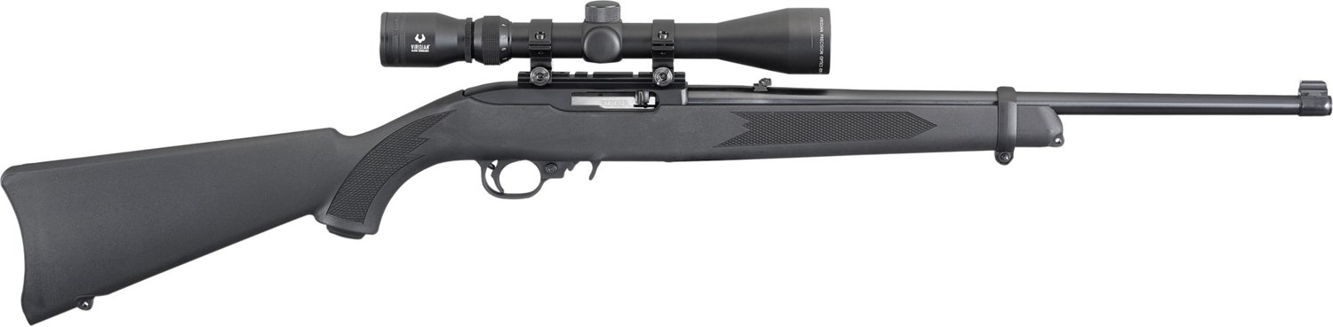 Stay confident in the field with the Ruger 10/22 Carbine 22 LR 18.5 in Rifle. This 22 LR caliber firearm comes with a factory-mounted Viridian® EON 3-9 x 40 scope and boasts a cold, hammer-forged barrel with an alloy steel construction and a satin finish. The design is complemented with a glass-filled polymer trigger, a gold bead front sight and an adjustable rear sight.
