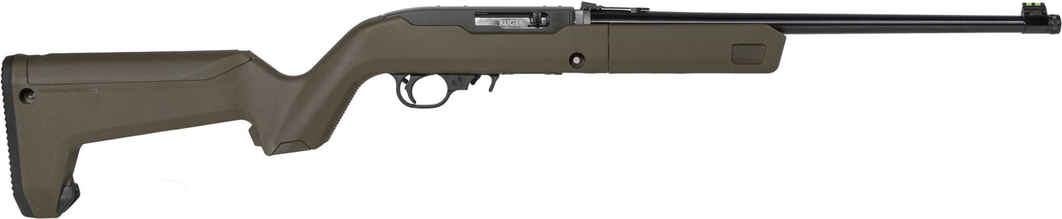 For a dependable rifle, trust the Ruger 10/22 Magpul OD Backpacker Takedown .22 LR Rimfire Rifle. This rimfire rifle features a precision-rifled, cold hammer-forged barrel and heat-stabilized, glass-filled polymer trigger housing. This firearm also has a Magpul® X-22 Backpacker stock with an ergonomic hand guard and integrated storage compartments in the grip and the stock.