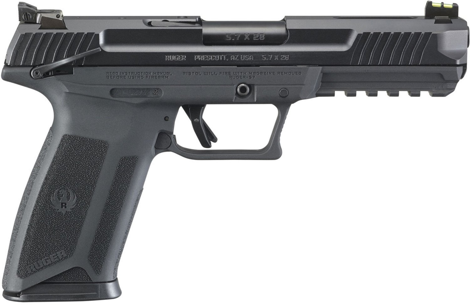 Introducing the Ruger 57 5.7 x 28mm Pistol. Boasting a magazine capacity of 20+1 rounds and a 4.94-inch barrel length, this pistol operates with a Double Action Only (DAO) action. Designed with ambidextrous safety features and a durable polymer frame with a Picatinny Rail. The sleek black polymer grips provide a comfortable yet firm hold. This pistol features a fiber optic sight configuration, including a front sight and adjustable rear sight, with a serrated black oxide steel slide and an overall length of 8.65 inches. Each purchase includes 2 magazines. Weighing 24.50 ounces, the Ruger 57 delivers unparalleled performance and functionality for the discerning shooter.