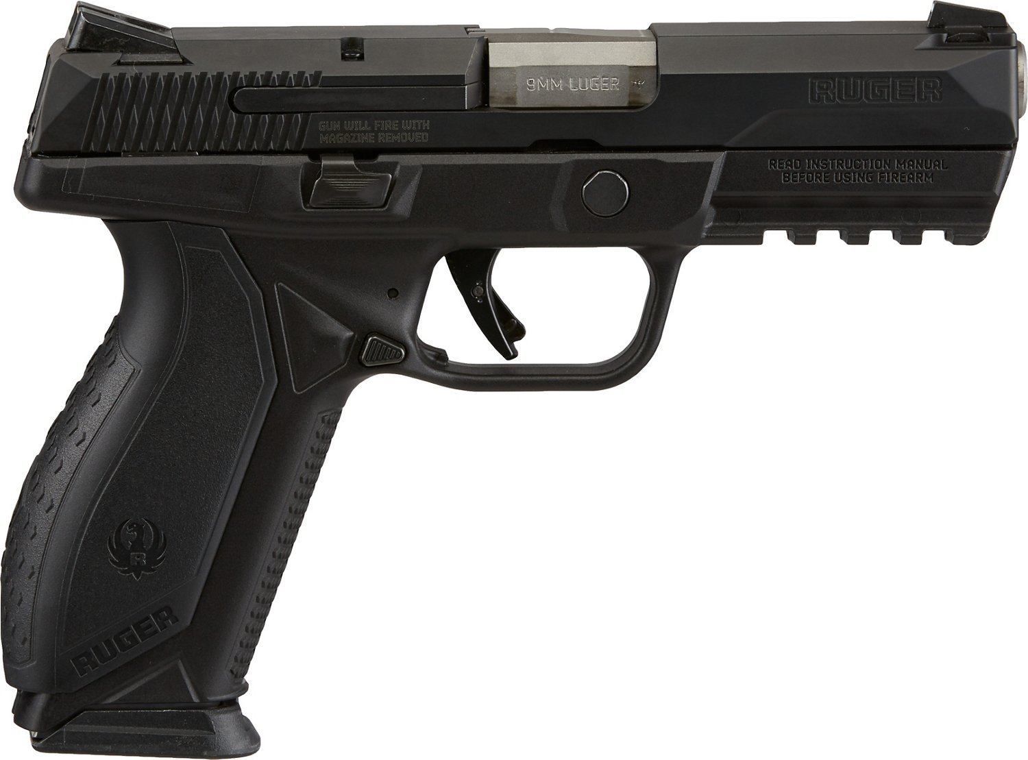 The Ruger® American 9mm Striker-Fired Pistol is designed with a recoil-reducing barrel cam and a stainless-steel slide. The pistol features a modular wraparound grip system with an adjustable palm swell and trigger reach and Novak® LoMount Carry 3-dot sights. Includes 2 nickel-Teflon® plated steel magazines.