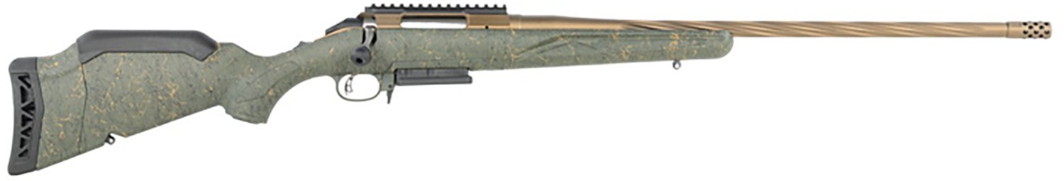 Arm yourself with the Ruger American Predator Gen 2 .22 Creedmoor Bolt Action Rifle. It is bolt action with a 3 + 1-round capacity. The stainless steel, spiral fluted threaded barrel with a Burnt Bronze Cerakote finish is 22-inches long, and its synthetic stock is equipped with a Green Splatter finish. The 3-position tang safety finishes off the design.