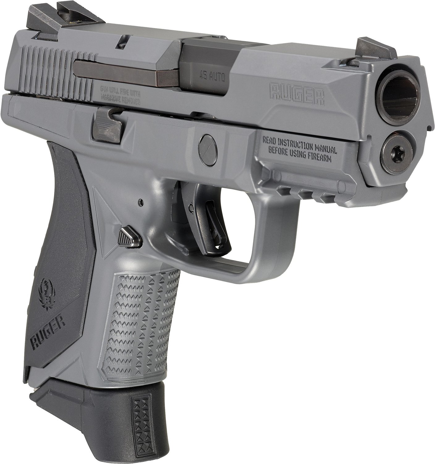 The Ruger American Pro Compact Gray 45ACP Semiautomatic Pistol features a MIL-STD-1913 Picatinny rail and Novak LoMount Carry 3-Dot sights. The pistol comes with three 7-round nickel-Teflon plated magazines.