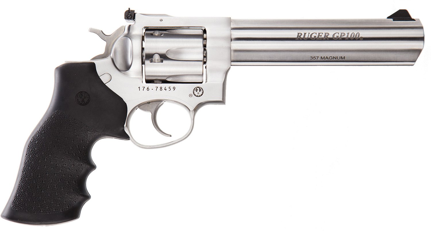 Built from stainless steel, the Ruger GP100 .357 Magnum Revolver boasts a triple-locking cylinder that's firmly secured to the frame at 3 points, a rubber Hogue® Monogrip® and a transfer bar safety mechanism. Ramp front sight. Adjustable rear sight.