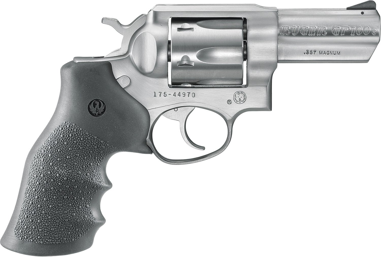 The Ruger GP100 Standard .357 Magnum Revolver is equipped with Hogue® Monogrip® rubber grip, a transfer bar safety and a fixed-ramp front sight. This handgun also boasts a triple-locking cylinder and comes with a hard plastic storage case.