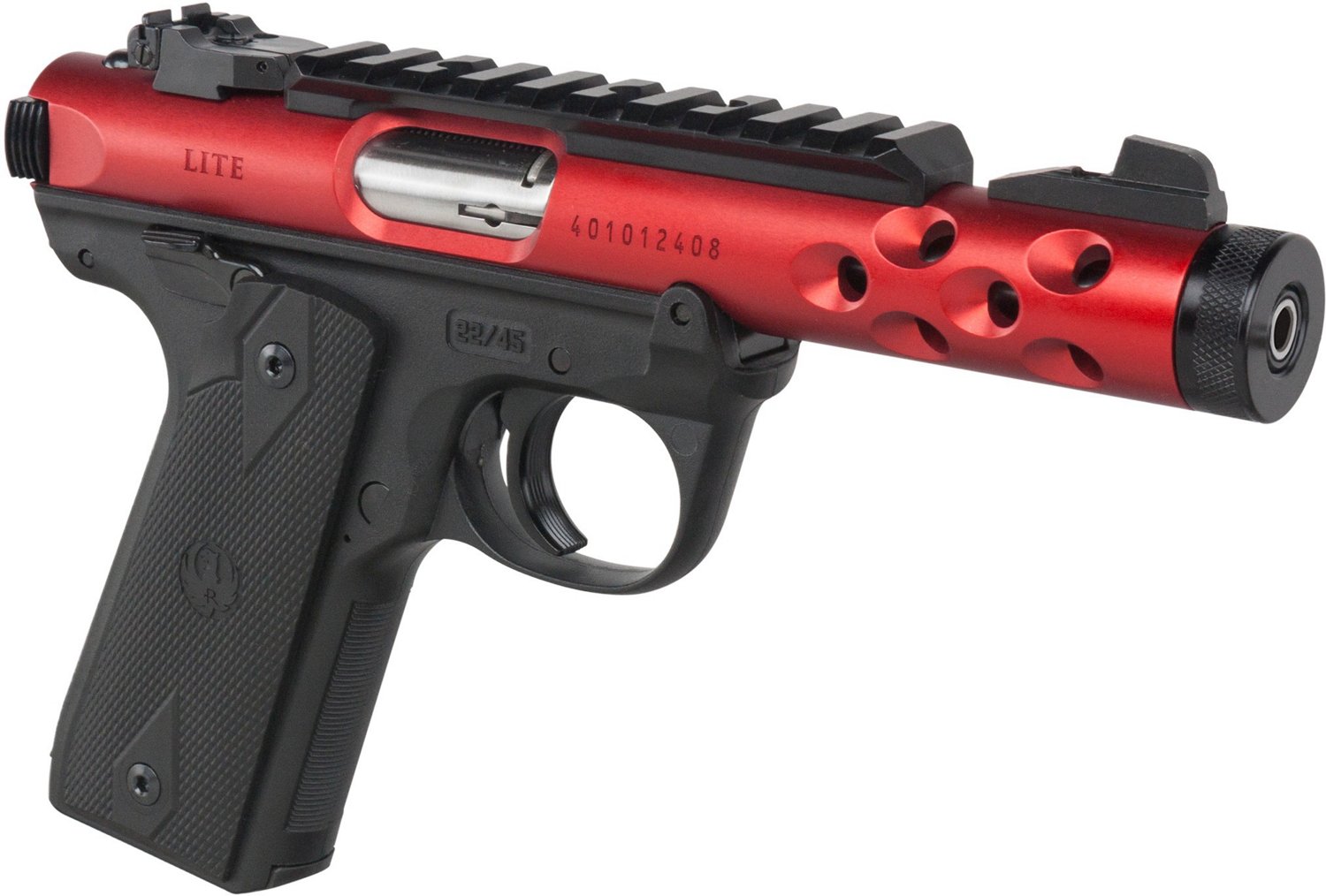 The Ruger Mark IV 22/45 Lite Red 22 LR Semiautomatic Pistol features a precision-molded polymer grip and a threaded barrel. There is an ambidextrous manual safety, and the pistol comes with two 10-round magazines.