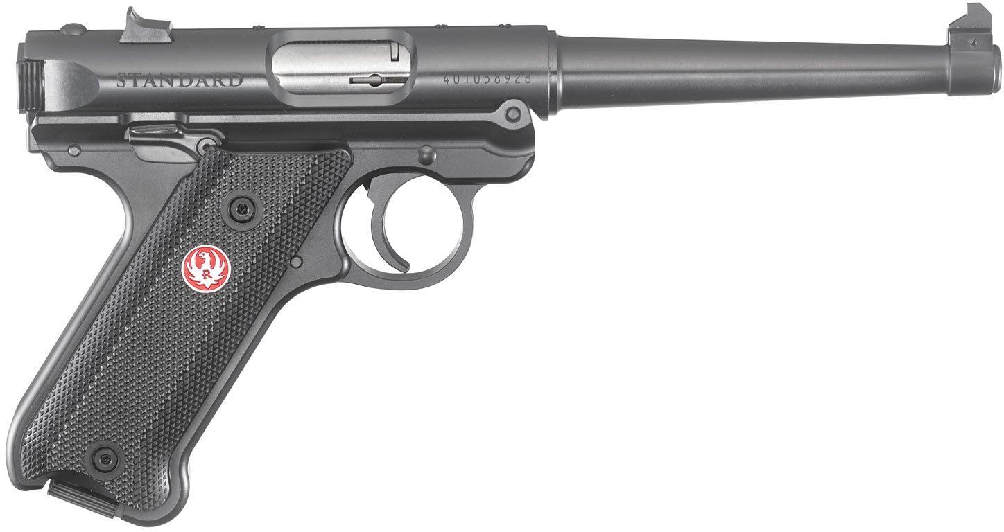 Designed with a tapered barrel, the Ruger Mark IV Standard .22 LR Pistol comes with two 10-round magazines and features a push-button magazine release. The main frame is made from blued steel while the grip frame is constructed from 1-piece, CNC-machined aluminum with checkered paneling. It comes with fixed sights and a drilled/tapped receiver for optics mount. 1-button take down.