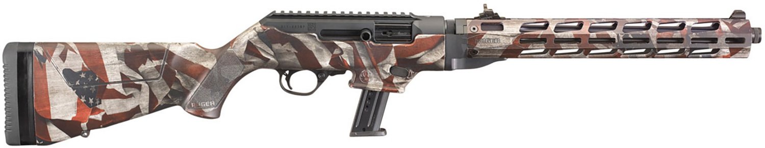 The Ruger PC Carbine 9mm Luger 17+1 American Flag Cerakote Bolt Action Rifle features a threaded barrel and cerakote stock with American flag camo graphics. The soft rubber buttpad with spacers allows the rifle to be properly sized for different shooters, while the cold hammer-forged, chrome-moly steel barrel with ultra-precise rifling provides accuracy and longevity.